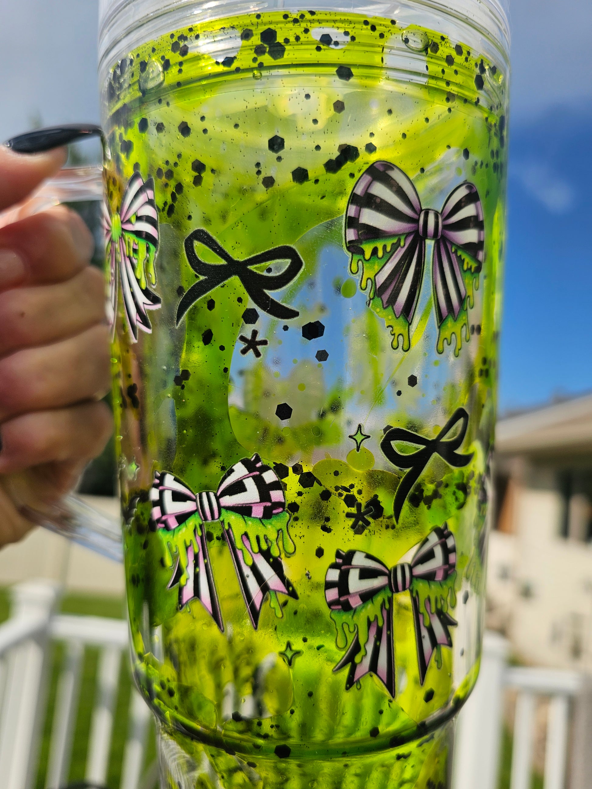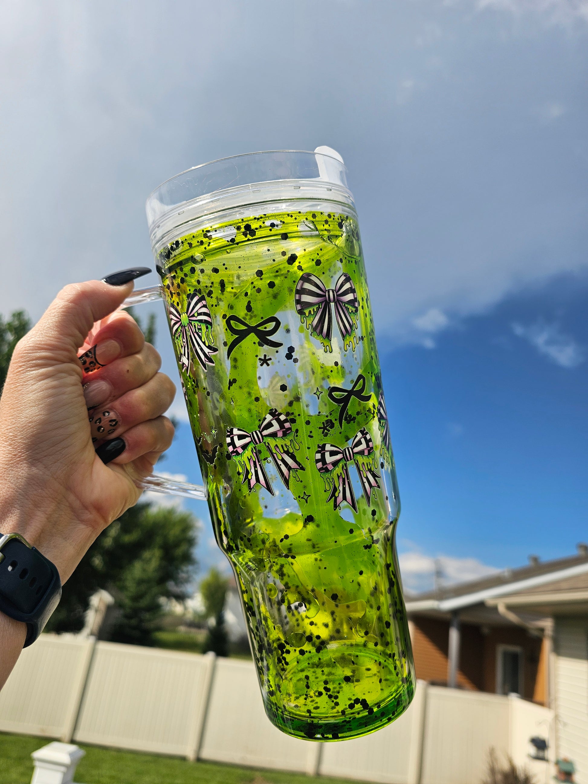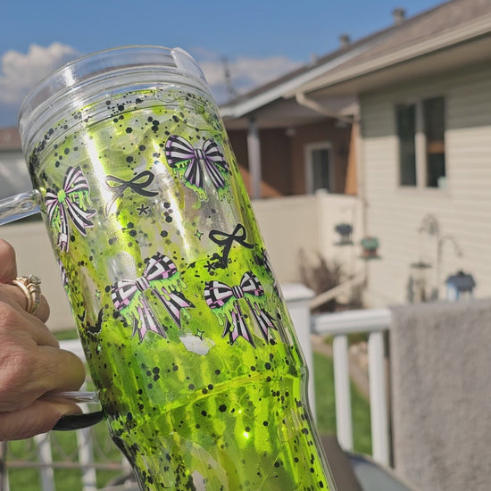 Stay hydrated on the go with our Ready to ship B Juice 40 oz Acrylic Tumbler Snowglobe with handle, lid and straw. B juice themed with Lime Green Lava Flow